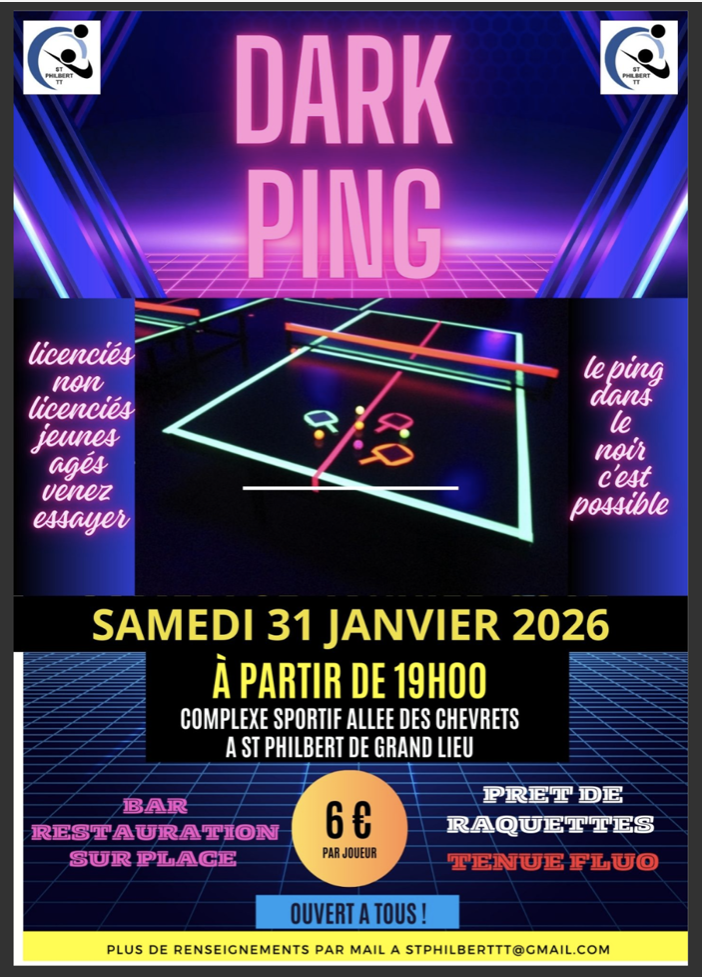 Le Dark Ping, c’est l’occasion de découvrir le ping dans le noir, de manière ludique et amusante, dans une ambiance conviviale et originale